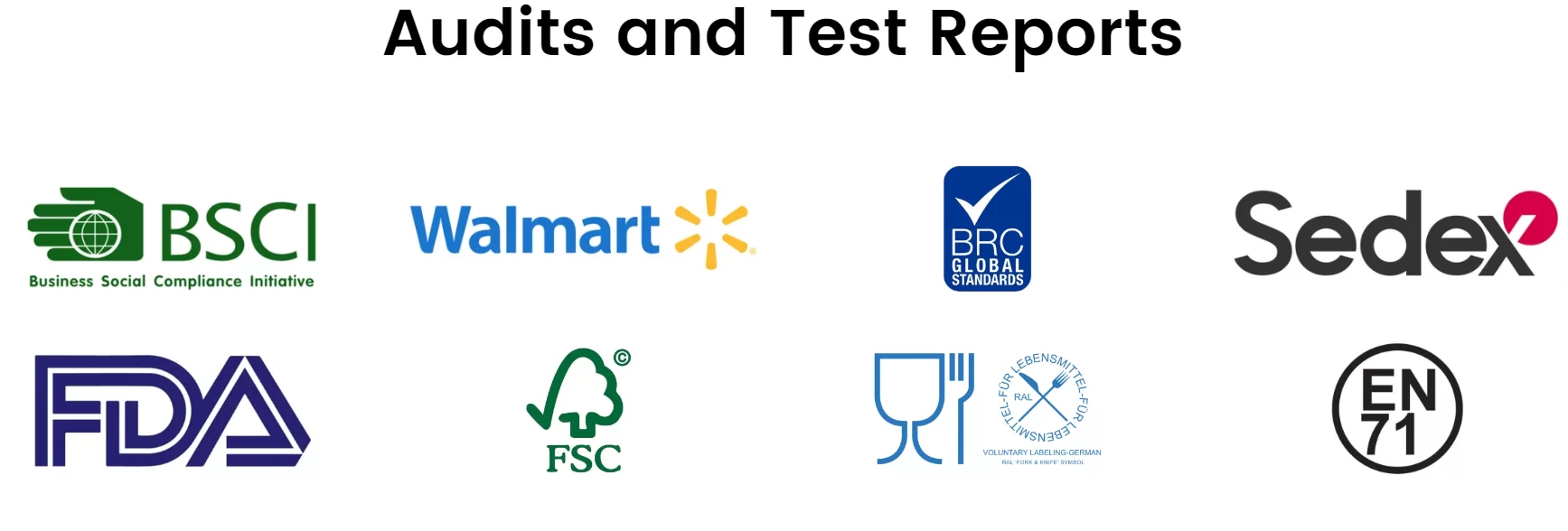 With over 76 partner vendor factories, we can provide one-stop service for our customers. Our products can pass LFGB, DGCCRF, FDA, EN71 and REACH. Vendor partners with BSCI, Sedex, EUDR, BRC, FSC, Walmart and related audits.